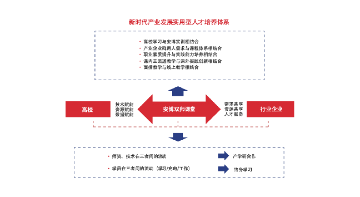 2006年,安博IT实训体系通过教育部科技成果鉴定,并以此体系为基础安博与教育部开展“IT实训推广工程”。安博首创大规模园区型实训基地布局在环渤海、长三角地区等经济带,融入区域经济发展。2015年, “安博应用技术型人才培养体系与创新模式”通过教育部科技成果鉴定。今天,安博面向人工智能、智能制造、大数据、云计算、集成电路等领域推出系列课程体系,通过自主技术创新推出3D全息教室、智能校园等系列智慧教育物联解决方案,携手合作机构开启新的未来。机构”等荣誉。